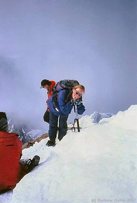 Endlich könnte man die Aussicht genießen, wenn es denn eine gäbe. Der Gipfel hüllt sich langsam in Wolken.