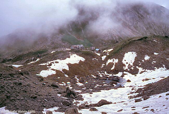 Vom Einstieg schauen wir zurück auf die Lamsenjochhütte.