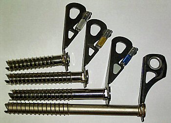 die "selbstausdrehende Eisschraube" werden sie gerne verwendet. Werden die Schrauben kürzer, so sinken auch die Haltekräfte. Kürzere Schrauben werden verwendet, wenn die Eisauflage zu dünn ist, um eine normal lange Schraube zu setzen. Vor allem beim Wasserfallklettern sollte man immer verschiedene Längen parat haben. Praktisch ist eine Farbmarkierung, die die Länge der Schraube angibt (bei den beiden mittleren Schrauben). |